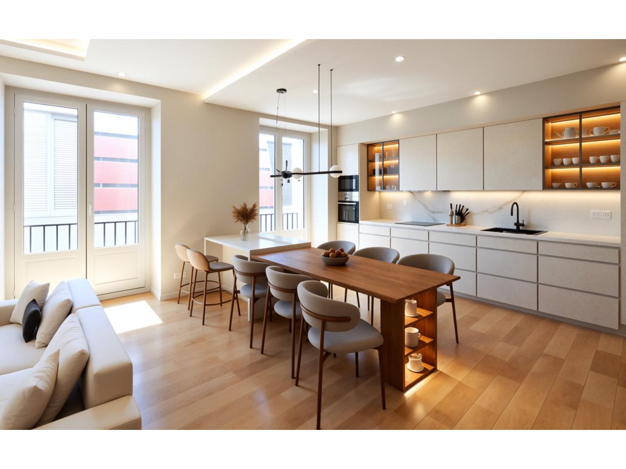 Las cocinas, completamente equipadas con electrodomésticos de última generación, han sido diseñadas para integrarse de forma elegante en el conjunto de la vivienda, combinando funcionalidad y diseño.